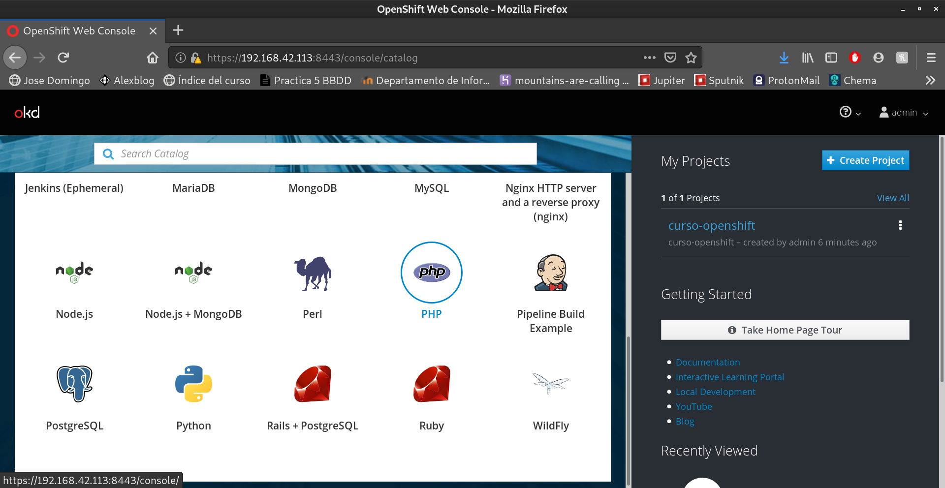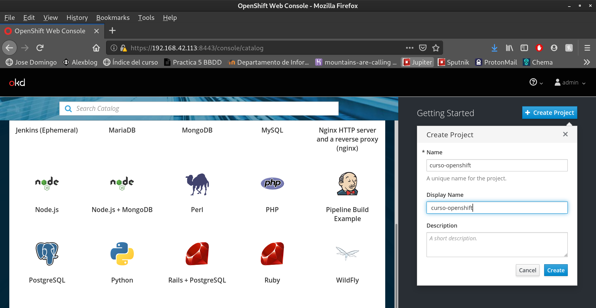 oc login -u system:adminComo es una herramienta para desarrollar o simplemente experimentar un poco con OpenShift, obviamente carece de sistemas de seguridad, por lo que podremos acceder al panel web con el usuario developer y cualquier contraseña. Una vez que hayamos iniciado sesión, creamos un proyecto.