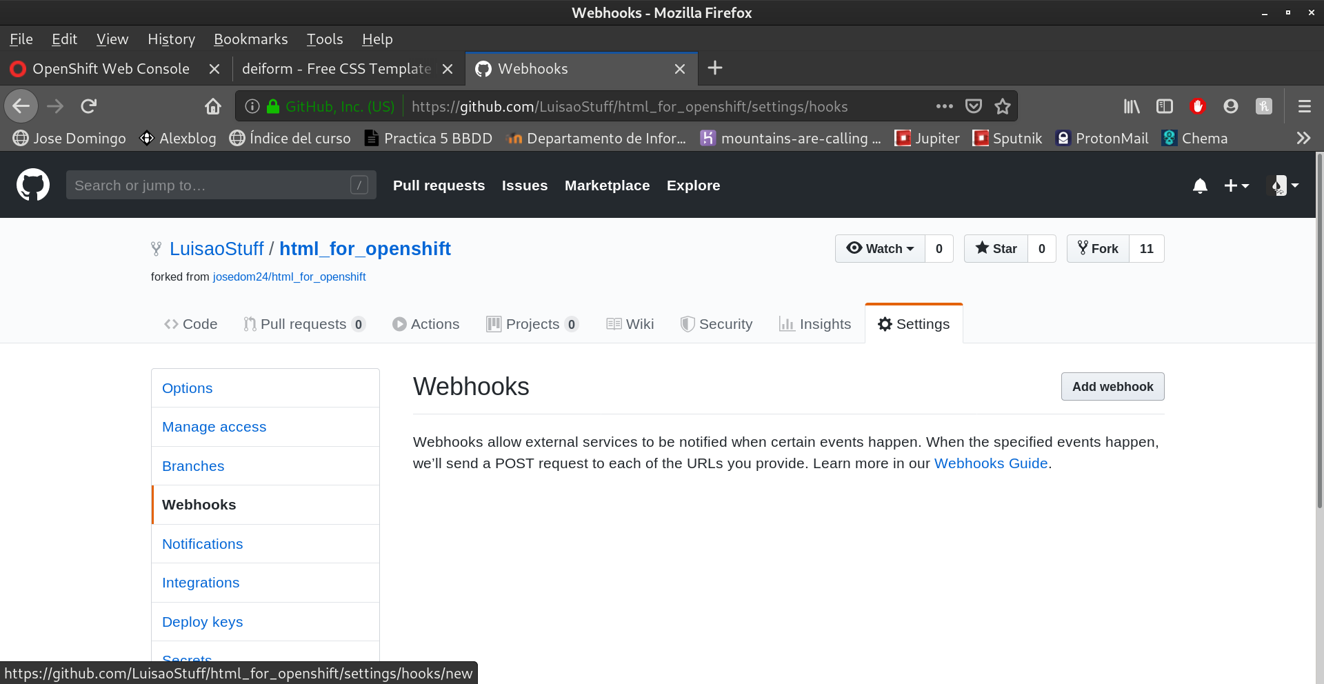 Después nos dirigimos a la página de nuestro repositorio, accedemos a la configuración y seguidamente a Webhooks.