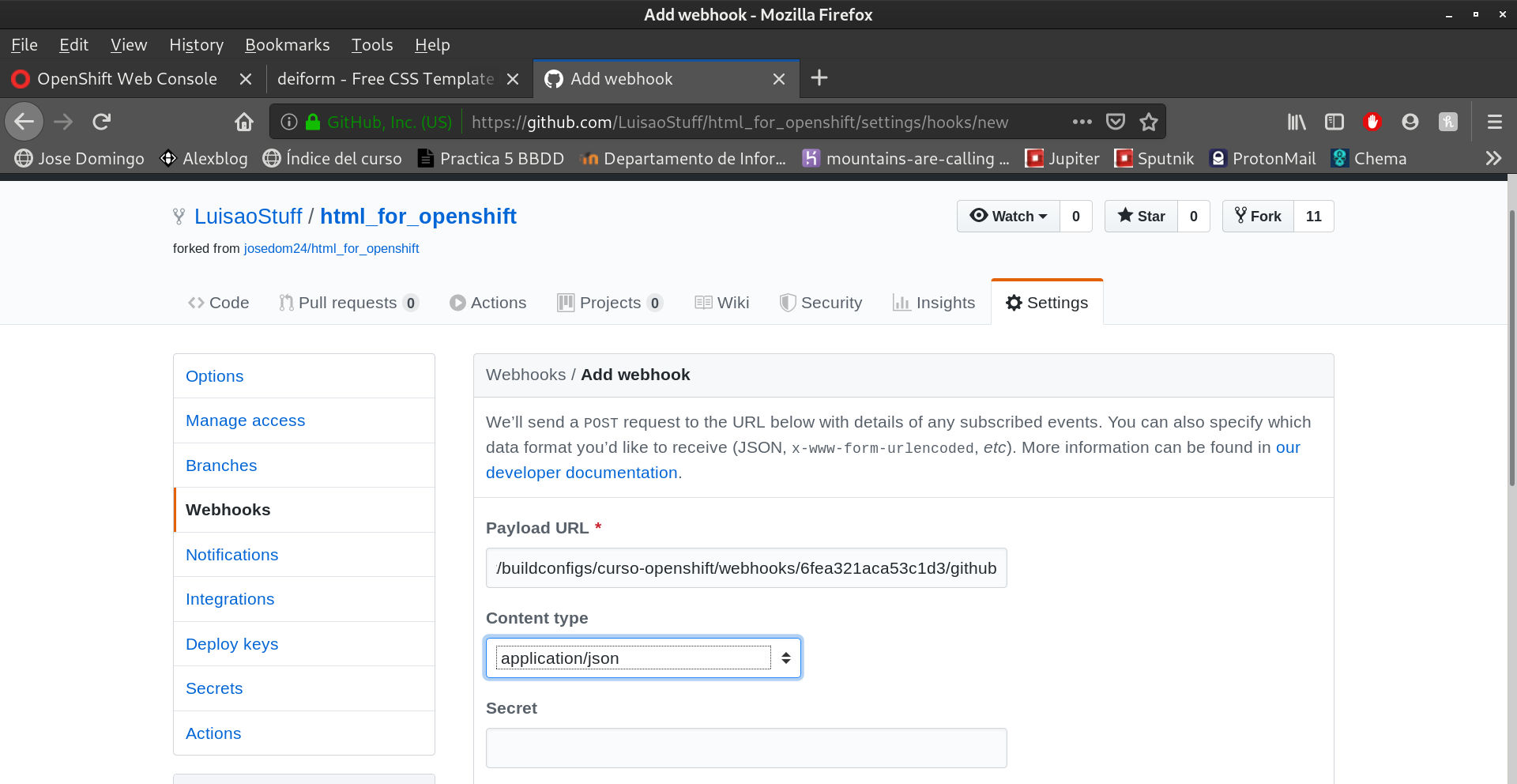 Como ya vimos en la entrada de integración continua con jekyll y Travis CI, github nos proporciona la posibilidad de hacer uso de webhooks para que aplicaciones como OpenShift realicen unas determinadas tareas en un determinado evento disparado por un git commit, un git push… en resumen, una modificación del repositorio. Para activar esta funcionalidad, entramos en la configuración de los builds de nuestro proyecto y copiamos el enlace indicado como Github Webhook URL.