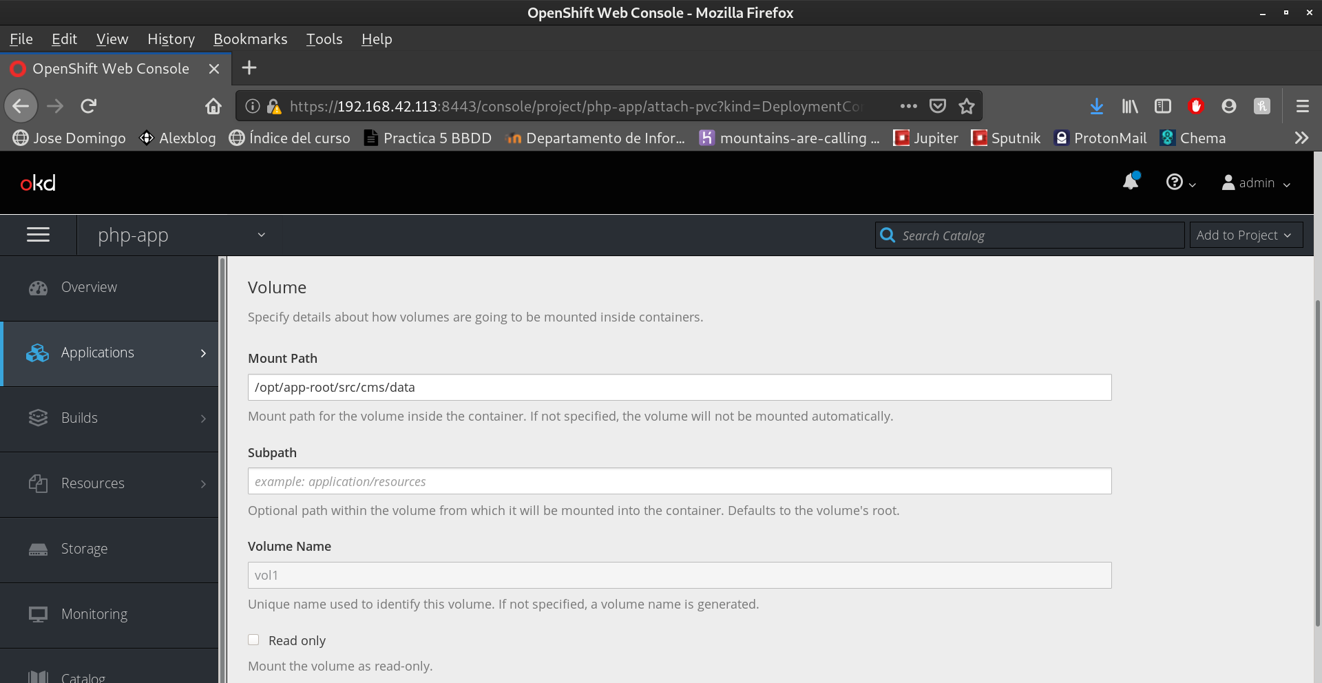 vol1 Bound pv0030 1Gi RWO,ROX,RWX 5sUna vez que tenemos la ruta donde se guardan los datos, accedemos al apartado de deployments y en el menú desplegable actions seleccionamos add storage