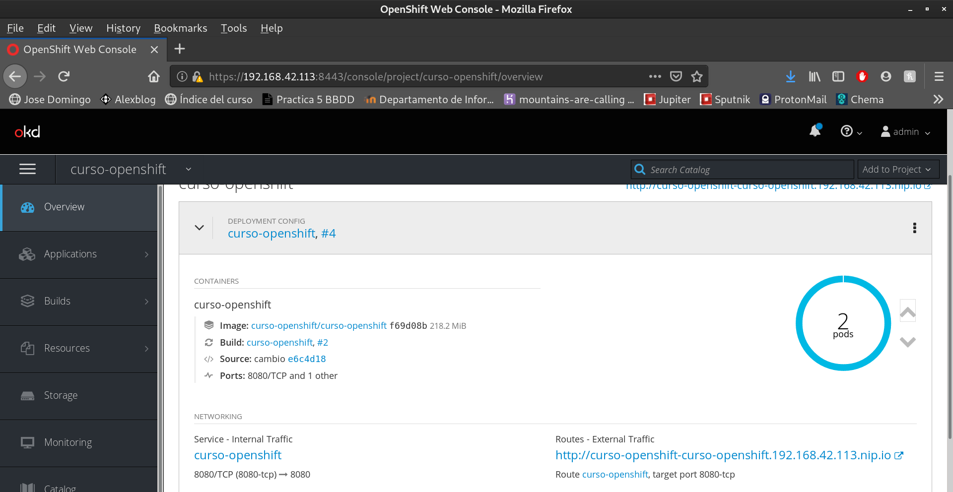 2 infos identified, use 'oc status --suggest' to see details.De la misma forma que en el panel web, podemos realizar múltiples tareas desde el cliente oc como escalar el número de pods, e incluso algunas más como obtener información de estos que está creando OpenShift con kubernetes.