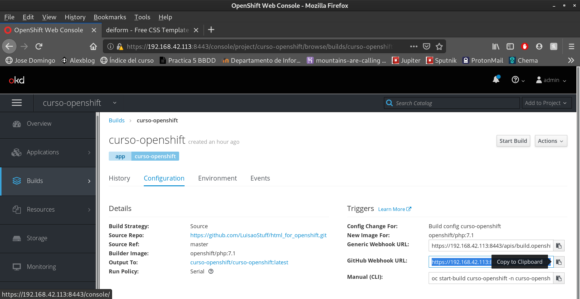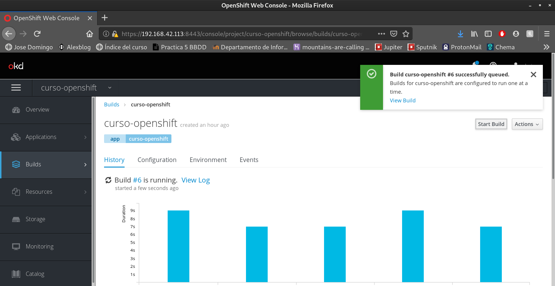 En este momento nos pondremos desde el punto de vista del desarrollador. En principio no tendríamos que saber como funciona todo esto por debajo, ya que para eso estamos utilizando esta capa de abstracción sobre docker, kubernetes, etc. Es por esto que a la hora de seguir un control de versiones, OpenShift nos facilita la vida. Realizaremos un cambio del código en nuestro repositorio remoto, algo tan simple como cambiar una linea del html. Después solo tendremos que dirigirnos al apartado builds, entrar en nuestro proyecto y seleccionar start build.