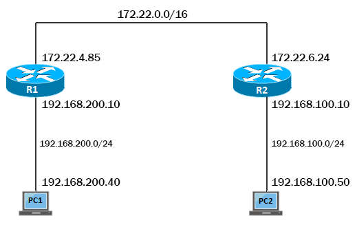 A diferencia del escenario anterior, una VPN sitio a sitio se basa en un concepto algo distinto. Mientras que en el primer caso, hemos conectado una máquina a una red remota, en este caso vamos a conectar dos redes remotas, por lo que técnicamente, estaremos fusionando las dos redes a nivel de aplicación. En este nuevo escenario, tendremos dos máquinas en redes locales diferentes; por un lado la 192.168.100.0/24 y por otro lado la 192.168.200.0/24. A su vez, cada una de estas máquinas estará compartiendo la red con un servidor que serán los que gestionen la conexión de la VPN, que tendrán una red común, la 172.22.0.0/16. Por lo tanto el exquema de la red es el siguiente: